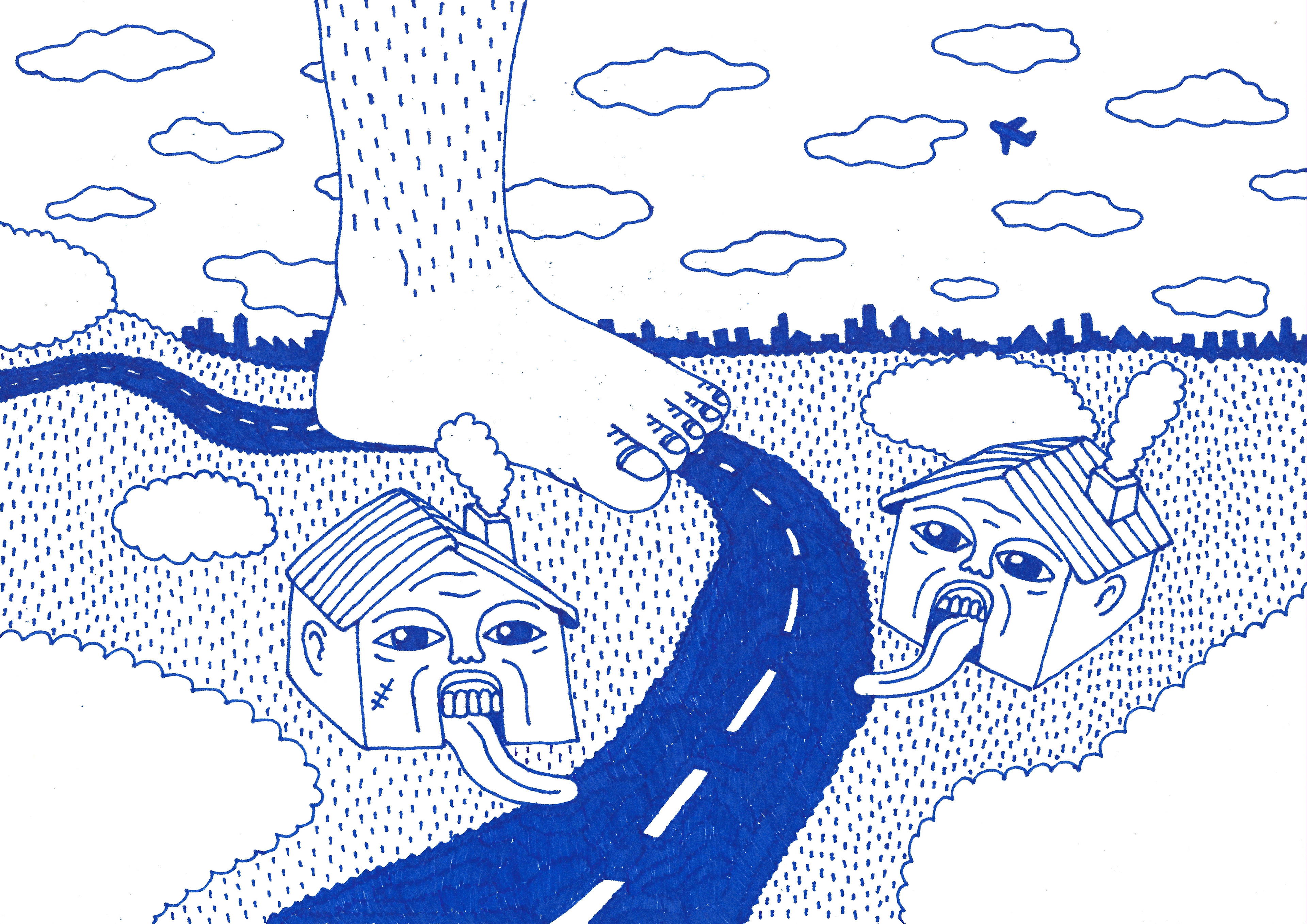“Azules Dibujos” is a series of drawings that emerged spontaneously from my desire to use a marker I found and my commitment to starting and finishing scenes using only that tool, without making a preliminary sketch, on A4 printer paper. Letting the idea flow at the same time as my hand, coming together almost by accident.